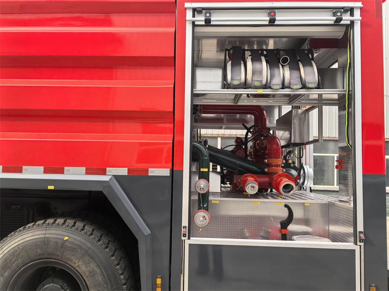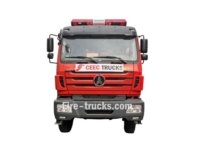 El camión de bomberos Beiben 2638 6x4 está equipado con un motor Weichai WP10.380E32 y una caja de cambios FAST 12JS160T. La parte delantera de la plataforma es un compartimento para equipos con paredes texturizadas antideslizantes de aleación de aluminio, donde se almacenan diversos equipos. La sección central alberga un tanque de agua de acero al carbono de 10 metros cúbicos y un tanque de espuma de 2 metros cúbicos. La sala de bombas trasera está equipada con una bomba contra incendios CB10/60-RS, un panel de control, mangueras contra incendios y herramientas que incluyen un colector de agua, boquillas contra incendios y pistolas de espuma. Un monitor de incendios PL8/48 está montado en el techo de la plataforma.