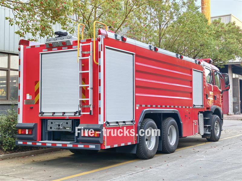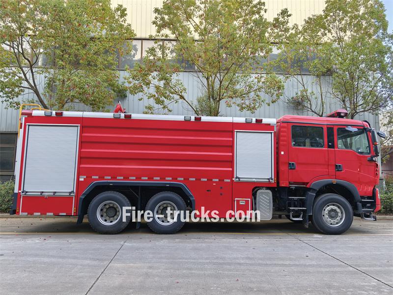 El camión de bomberos de espuma Howo TX460 6x4 de 12 metros cúbicos cuenta con una cabina Sinotruk TX 6x4, una distancia entre ejes de 4600+1400 mm y está equipado con un motor SINOTRUK MC11.46-61 y una caja de cambios HW19710. La parte delantera de la superestructura alberga un compartimento para almacenar diversos equipos de extinción de incendios, mientras que la sección central contiene un tanque de agua de acero al carbono de 9 metros cúbicos y un tanque de espuma de 3 metros cúbicos. La sección trasera alberga la sala de bombas, equipada con una bomba contra incendios CB10/60-RS, un panel de control y algunos equipos auxiliares de extinción de incendios. Los tanques de agua y espuma en el techo cuentan con pozos de acceso, y también incluye un monitor de incendios PL8/48.