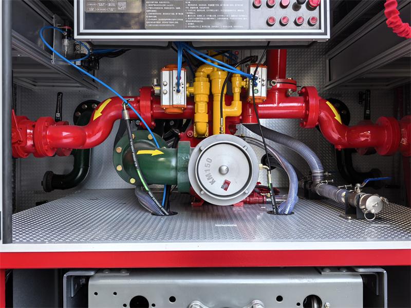 Sistema de tanque: La parte delantera es la sala de equipos, donde se almacenan diversos equipos contra incendios (como mangueras, extintores, hachas, llaves inglesas, martillos, picos, etc.) para facilitar el acceso. En el centro, se encuentran un tanque de agua de acero al carbono de 9 metros cúbicos y un tanque de espuma de 3 metros cúbicos, ambos con pozos de registro en la parte superior.