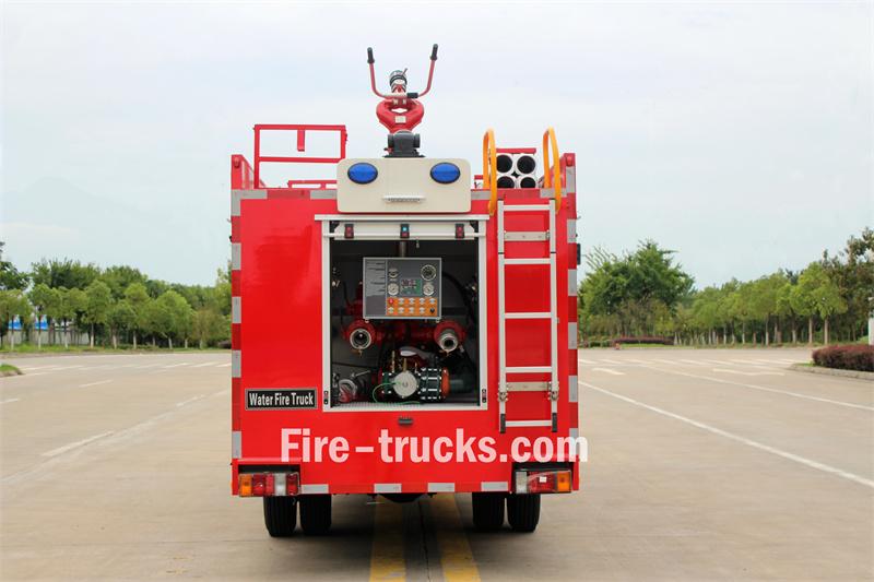 Este camión cisterna de agua Isuzu de 3 m³ se basa en un chasis Isuzu 100P 4x4 de doble cabina con una distancia entre ejes de 3360 mm. Está equipado con un motor Isuzu 4KB1-TCG60 y una caja de cambios MSB de 5 velocidades. La parte delantera de la superestructura alberga el compartimento de equipos, la sección central contiene un tanque de agua de acero al carbono de 300 l y la parte trasera es la sala de bombas, equipada con una bomba contra incendios CB10/60-XZ, panel de control, mangueras contra incendios, equipo contra incendios, etc. Un monitor de incendios PS8/30W está montado en el techo.