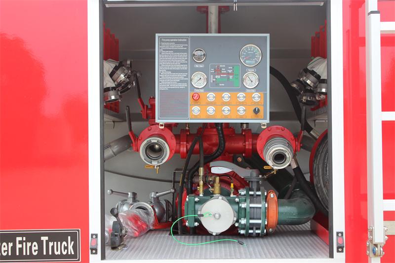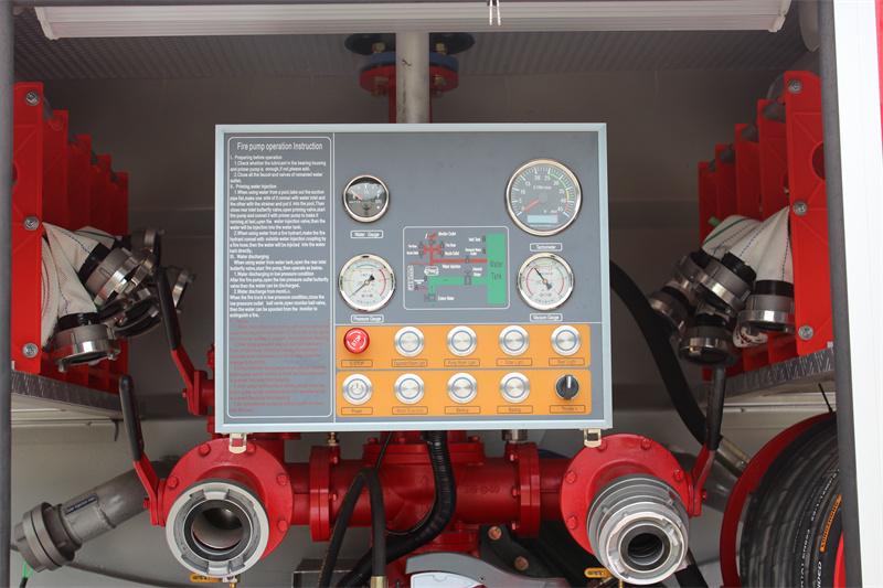 Panel de control: Ubicado en la sala de bombas, integra indicador de nivel de agua, manómetro, vacuómetro, tacómetro, freno de emergencia, luz de la sala de equipos, luz de la sala de bombas, luz lateral, luz trasera, interruptor de cebado, interruptor de energía principal, acelerador electrónico y otros botones; instrucciones de operación de la bomba contra incendios, diagrama de tuberías del tanque de agua, etc. La interfaz es intuitiva, lo que facilita el monitoreo y la operación en tiempo real de los botones relevantes por parte de los bomberos.