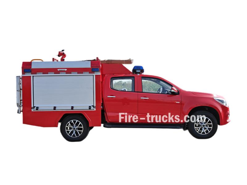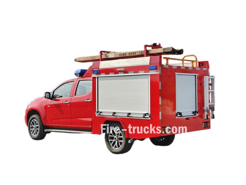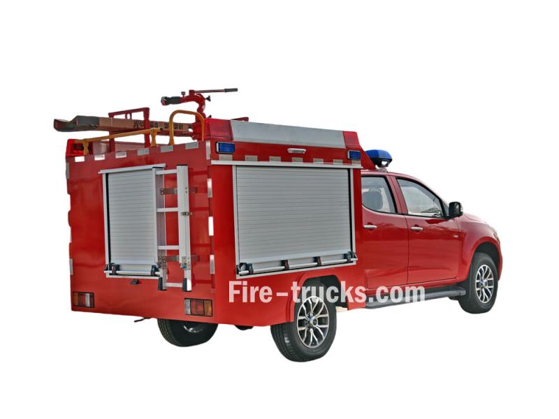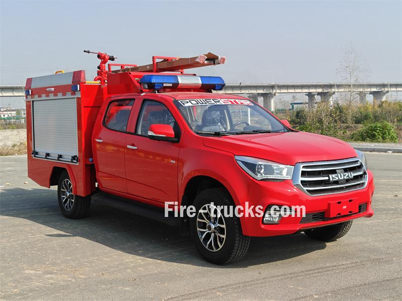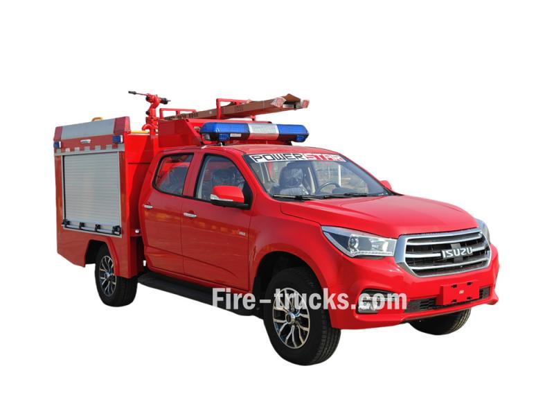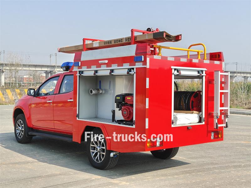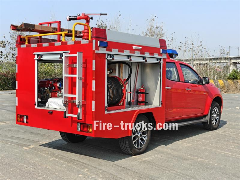 ≥50 mEste Camión de bomberos de espuma pequeño Isuzu de 500 litros Es una modificación del chasis de la camioneta pickup Isuzu Taga de doble cabina. Integra un tanque de agua de 500 litros y un tanque de espuma de 100 litros, y está equipado con un monitor de incendios montado en el techo, una bomba portátil y un carrete de manguera eléctrico, lo que permite la extinción de incendios tanto a larga como a corta distancia.