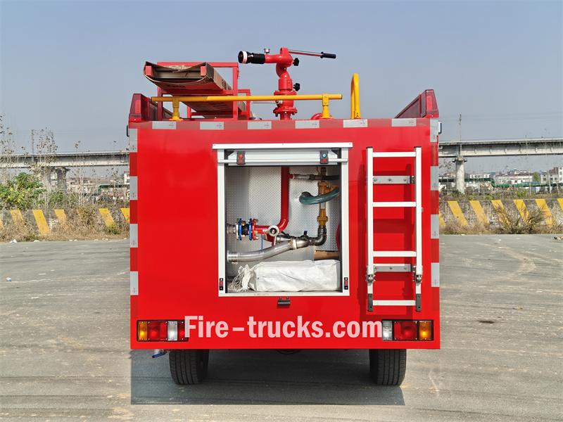 Este camión de bomberos Isuzu se basa en el chasis de la camioneta Isuzu TAGA QL1030CZHW2 Luxury Edition 3.0T diésel de 143 hp con tracción en las cuatro ruedas y doble cabina. Está equipado con un motor Isuzu 4HK1CT6H1 y una transmisión MLB de 5 velocidades. La parte delantera de la superestructura cuenta con un tanque de agua de acero al carbono de 500 L y un tanque de espuma de acero inoxidable de 100 L. La parte trasera alberga la sala de bombas, equipada con una bomba manual JBQ4.5/9, un carrete de manguera eléctrico de 50 m y un dosificador de espuma-agua PH64. El techo cuenta con un monitor de incendios PS8/20W, escalera, pozo de registro y luces de alarma.