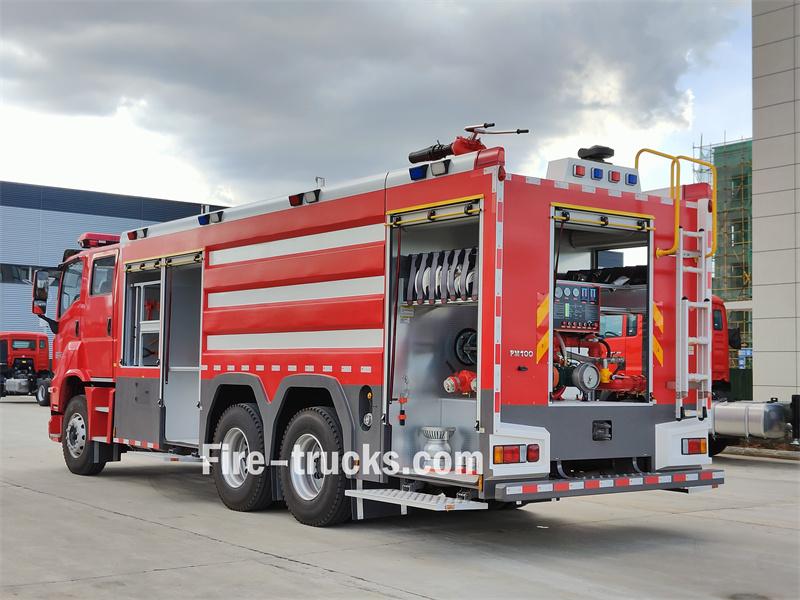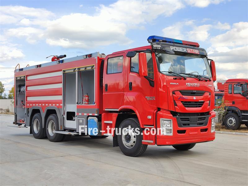 El camión de bomberos de espuma Isuzu GIGA 6X4 de 10 metros cúbicos se basa en el chasis Isuzu GIGA 6X4, con una distancia entre ejes de 4600 mm + 1370 mm. Está equipado con un motor Isuzu 6UZ1-TCG61 y una transmisión rápida de 12 velocidades. La parte delantera de la superestructura alberga el compartimento de equipos, la sección central contiene un tanque de agua de acero al carbono de 8500 L y un tanque de espuma de acero inoxidable de 1500 L, y la parte trasera es la sala de bombas, equipada con una bomba contra incendios CB10/60-XZ, panel de control, mangueras contra incendios, equipo contra incendios, etc. Un monitor de incendios PL8/48 se encuentra en el techo.