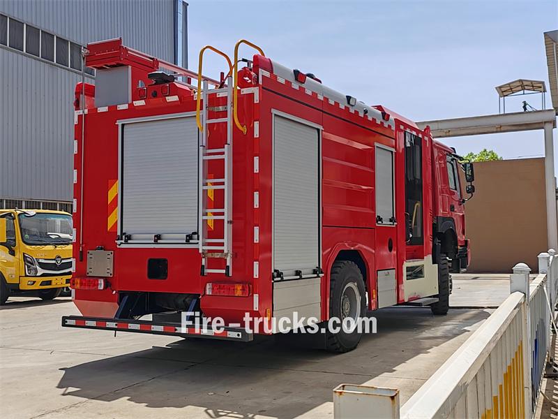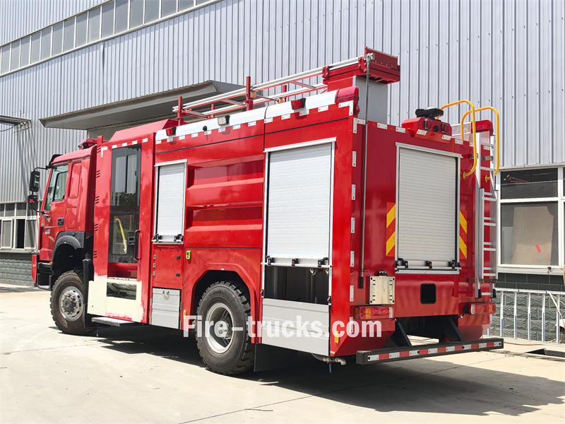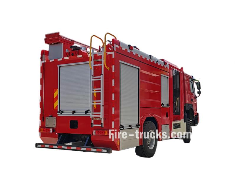 El Camión Cisterna de Incendios HOWO 4×4 es un vehículo todoterreno de extinción de incendios construido sobre un chasis SINOTRUK HOWO 4×4. Consta de varios componentes principales: un chasis de alto rendimiento, una cabina de tripulación independiente, un tanque de agua de acero de 6 metros cúbicos, un tanque de espuma de acero inoxidable de 2 metros cúbicos, una bomba contra incendios CB10/60, un monitor de incendios PL8/48 y un compartimento de equipo modular. También cuenta con una toma de fuerza tipo sándwich (PTO) y un sistema de tuberías profesional. Impulsado por un motor Weichai de 380 HP y un sistema de tracción a las cuatro ruedas (4x4) a tiempo parcial, combinado con neumáticos todoterreno profesionales, el vehículo ofrece una gran potencia y una excepcional capacidad todoterreno, además de adaptarse a entornos complejos.