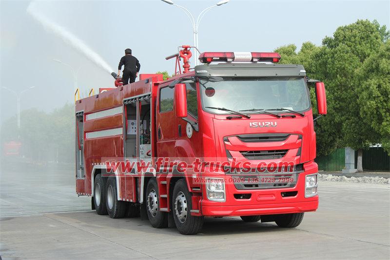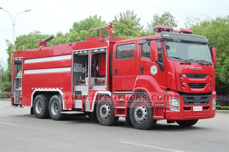 El camión de bomberos de polvo seco ISUZU GIGA está construido sobre un chasis ISUZU GIGA 8×4 de alta resistencia, equipado con un motor ISUZU serie 6WG1 y una transmisión manual FAST de 12 velocidades. El vehículo cuenta con una cabina de tripulación modificada de doble fila con capacidad para 2+4 personas. Transporta 12.000 litros de agua, 2.000 litros de espuma y 1.000 kg de polvo seco. El camión está equipado con un monitor de incendios CB10/60, un monitor de agua/espuma de doble propósito PL48 y un cañón de polvo seco PF40, que integra capacidades de extinción de incendios con polvo seco, agua y espuma para un uso versátil.